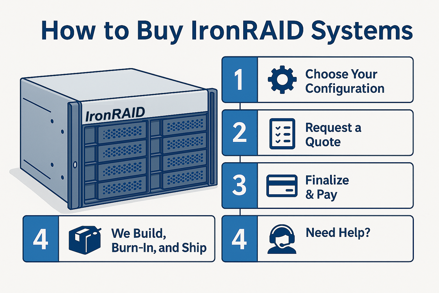 How to Buy IronRAID Systems How to Buy IronRAID SystemsIronRAID offers a streamlined purchase experience for businesses, government agencies, and enterprise IT teams. Whether you're ordering one system or outfitting a full rack, we make it easy to get the performance and reliability you need. 1. Choose Your ConfigurationStart with a base model or tell us what you need. We offer fully custom builds including RAID levels, drive types, controllers, chassis sizes, and OS integration. Not sure where to start? Our team will spec a solution around your workload. 2. Request a QuoteContact us directly for a fast, formal quote. Include your specs, use case, or existing system info. Quotes typically include lead time, shipping options, warranty details, and optional pre-configuration services. 3. Finalize & PayOnce approved, we accept secure payments via ACH, wire transfer, check, or purchase order (for approved accounts). Government and education buyers may use NET terms. 4. We Build, Burn-In, and ShipAll systems are assembled, tested, and burned in at our U.S. facility. You'll receive tracking info, rackmount hardware, and a full support packet. 5. Need Help?We’re available to assist with integration, rack layout, or performance tuning—before or after your purchase. IronRAID is a real partner, not just a parts vendor. Ready to get started? Contact IronRAID today to spec your custom system. Would you like to be an IronRAID Customer or Authorized Partner? Click Here to go to our inquiry page to learn how to become an i IronRAID Customer or Partner.