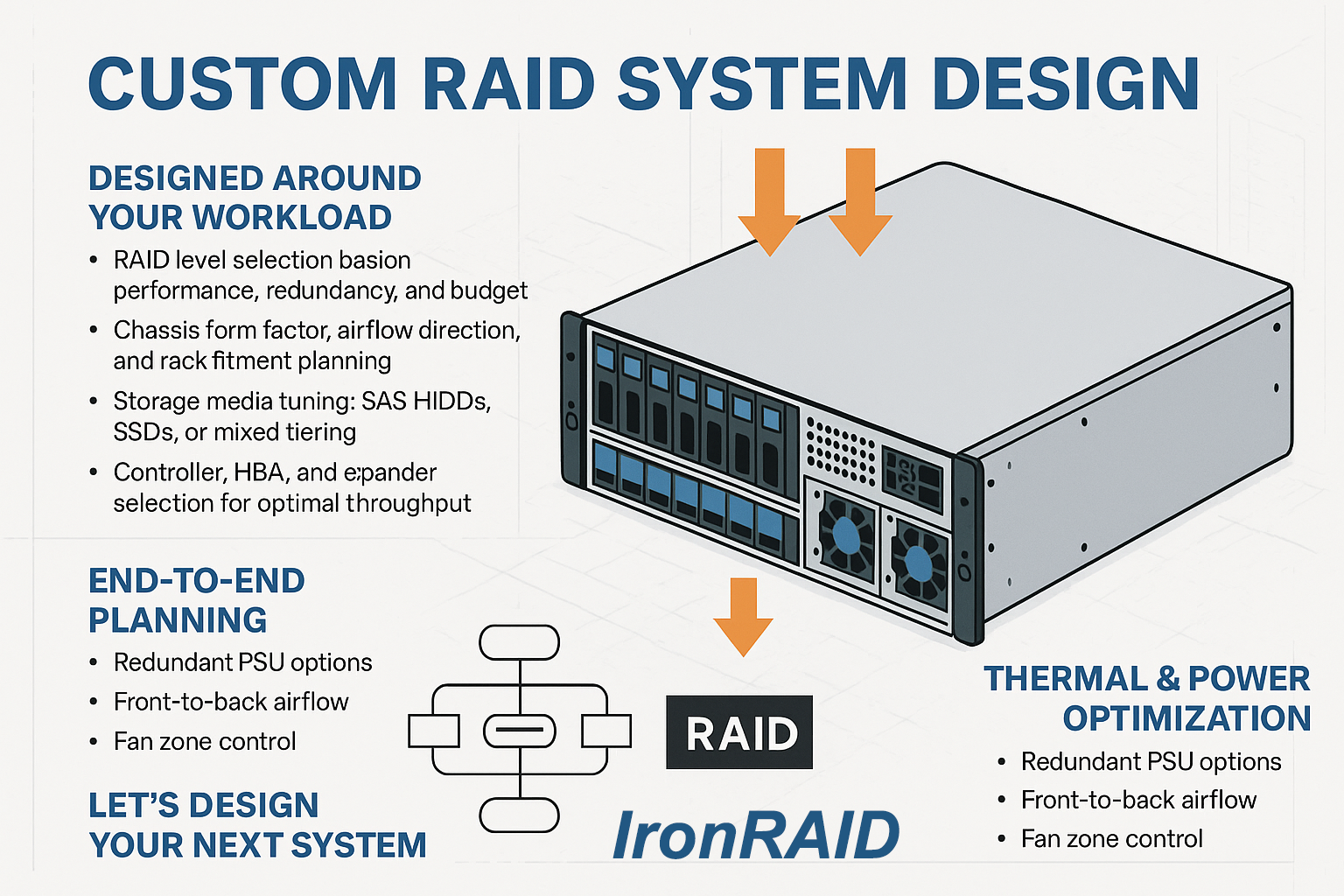 End-to-End PlanningFrom disk layout to firmware-level tuning, our engineers design every aspect of your system with reliability, uptime, and future expansion in mind. We also pre-stage the software environment—OS, drivers, remote access, and SAN/iSCSI configs—so you’re ready to deploy on day one. Thermal & Power OptimizationIronRAID systems are thermally profiled and tuned to deliver maximum longevity with minimal power draw. Redundant PSU options, front-to-back airflow, and fan zone control ensure rack compatibility and data center readiness. Let’s Design Your Next SystemTell us what you’re running—AI inference, security video, backups, or all of the above—and we’ll deliver a storage platform built to handle it. IronRAID means custom RAID, real-world performance, and true engineering support. Would you like to be an IronRAID Customer or Authorized Partner? Click Here to go to our inquiry page to learn how to become an i IronRAID Customer or Partner.