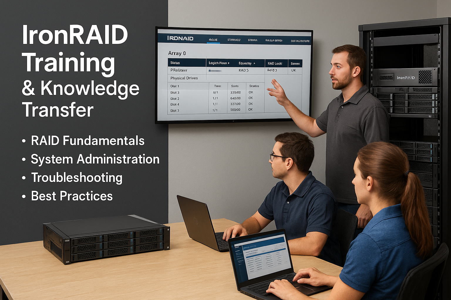 Page heading IronRAID Training & Knowledge TransferGetting the most out of your RAID infrastructure starts with knowing how to operate, monitor, and maintain it. IronRAID offers hands-on and remote training services designed for IT teams, MSPs, system integrators, and enterprise support personnel. Available Training Topics